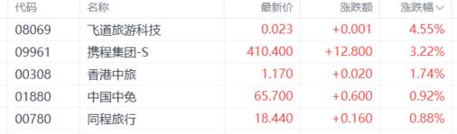 旅游及观光股活跃,携程集团涨超3%,香港中旅、中国中免、同程旅行等跟涨。