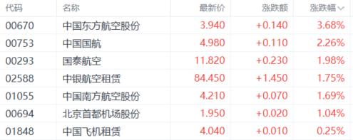 航空股走强,中国东方航空股份涨超3%,中国国航、国泰航空、中银航空租赁、中国南方航空股份等跟涨。