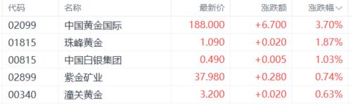 黄金股走高,中国黄金国际涨超3%,珠峰黄金、中国白银集团、紫金矿业、潼关黄金等跟涨。