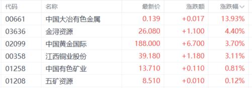 铜板块涨幅居前,中国大冶有色金属涨近14%,金浔资源、中国黄金国际、江西铜业股份、中国有色矿业、五矿资源等跟涨。