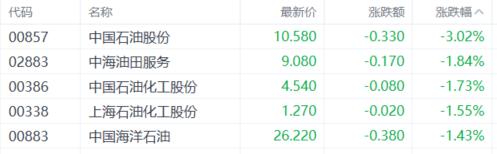 石油股下跌,中国石油股份跌超3%,中海油田服务、中国石油化工股份、上海石油化工股份、中国海洋石油等跟跌。