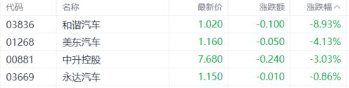 汽车经销商股持续走低,和谐汽车跌近9%,美东汽车、中升控股、永达汽车跟跌。