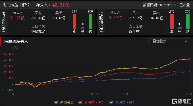 今日,南向资金净买入42.21亿港元,其中港股通(沪)净买入21.28亿港元,港股通(深)净买入20.92亿港元。