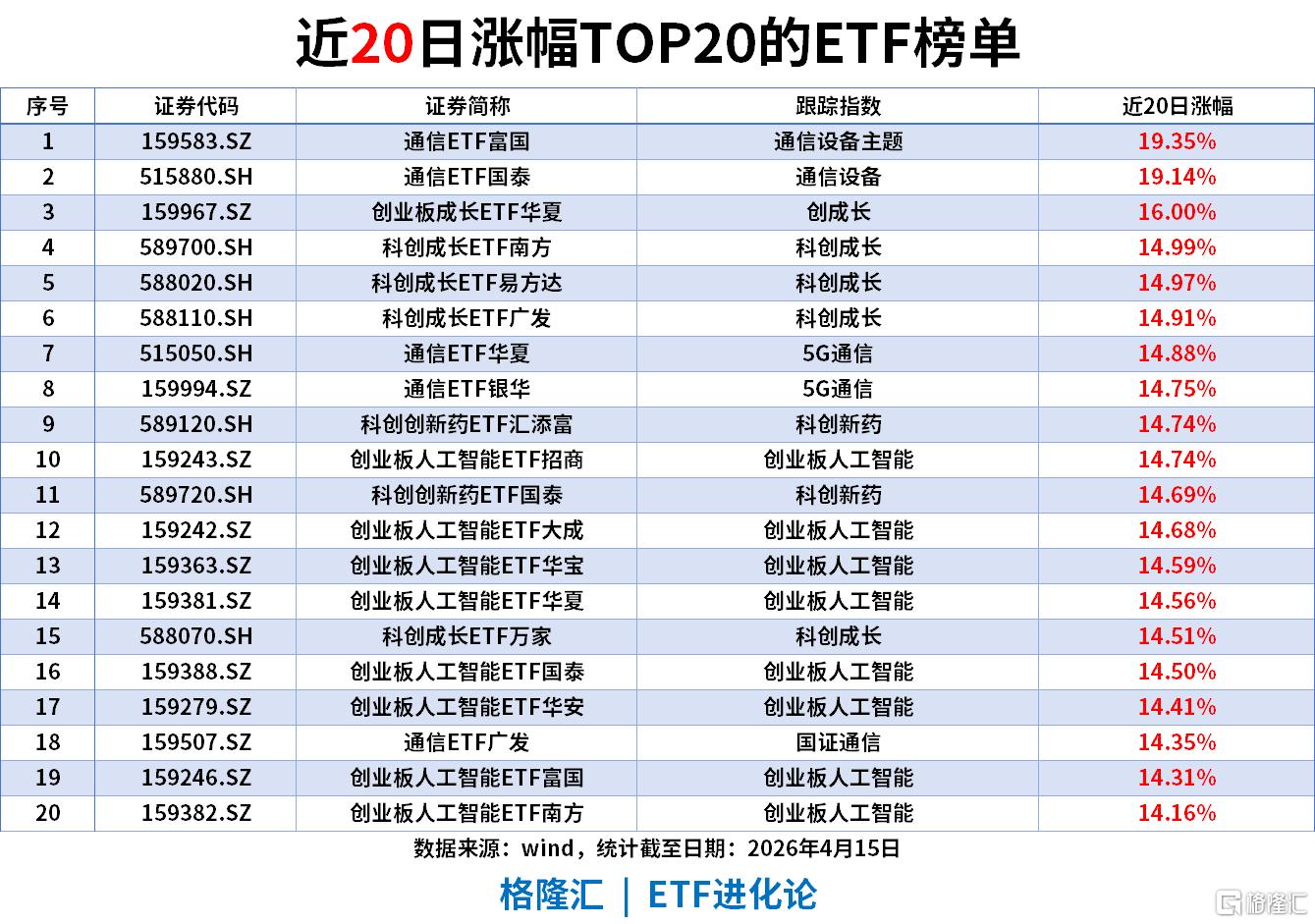 近20日涨幅(截至2026年4月15日)