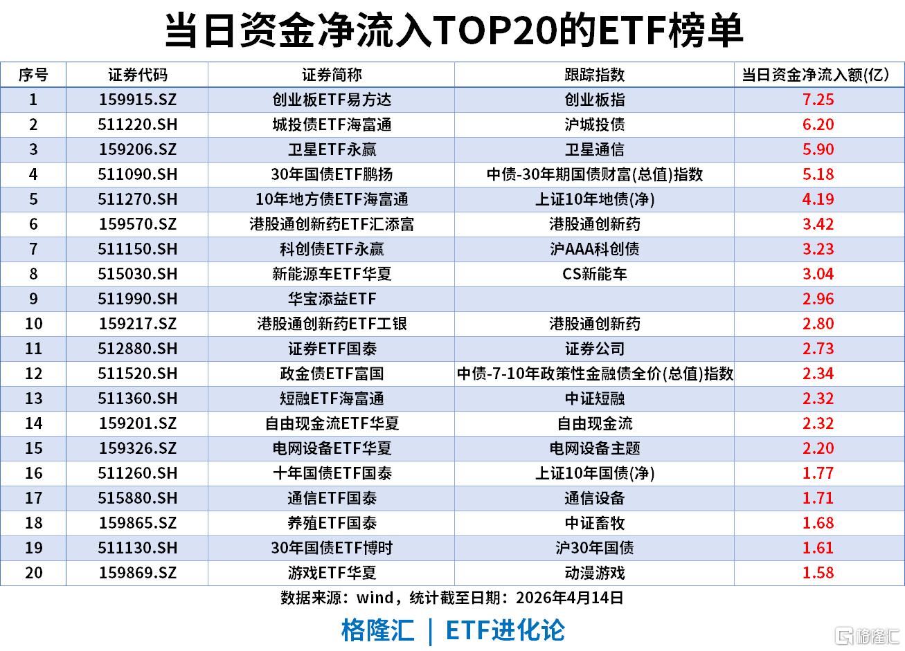 当日资金呈现防御与成长双向发力的格局,创业板ETF易方达以7.25亿净流入登顶,卫星ETF永赢以5.90亿净流入位列第三,城投债ETF海富通以6.20亿净流入居第二。