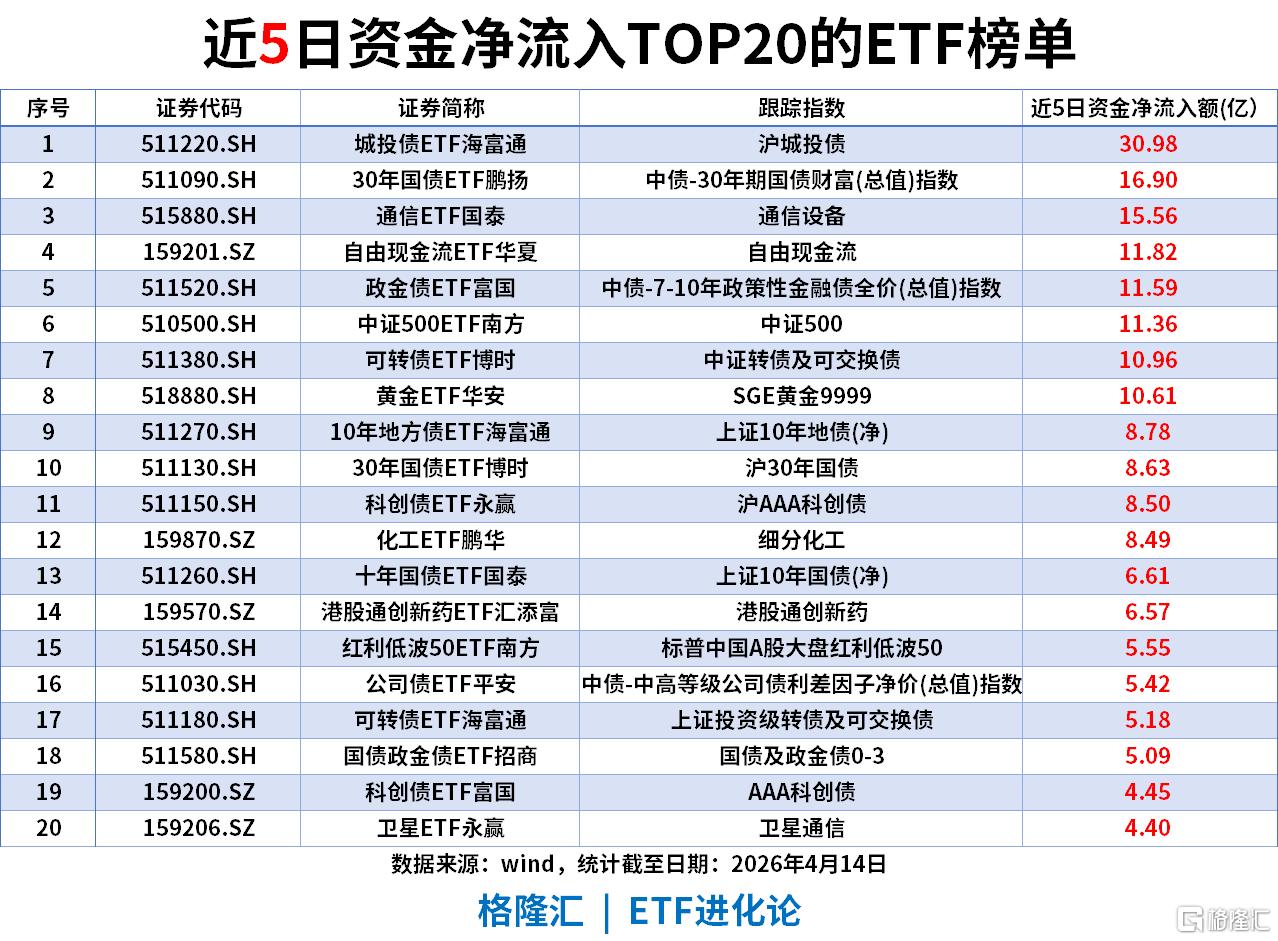 中长期资金形成固收防御、宽基与成长均衡配置的清晰格局:城投债ETF海富通以111.26亿净流入登顶,中证500ETF南方以46.01亿净流入位列第四,中小盘宽基的配置价值持续凸显。