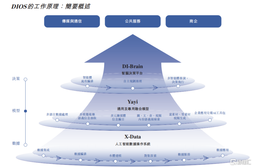 DIOS系统自下而上包含了三层:1、数据层——X-Data,企业级数据集成与分析平台;2、模型层——雅意大模型,旨在大幅提升对企业数据的处理与理解能力;3、决策层——DI-Brain,旨在精简人工智能应用开发流程的AI智能体开发平台。