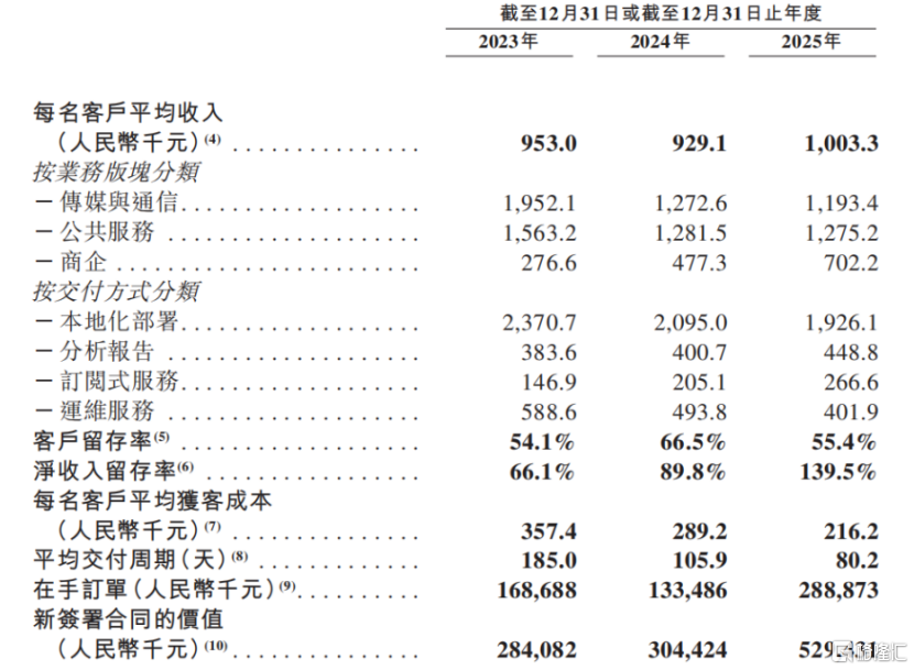 值得注意的是,过去几年,在传媒与通信行业、公共服务这两个行业,中科闻歌的客单价有所下降;2025年,这两部分业务的客单价分别为119.34万元、127.52万元,较2023年的客单价分别下降了38.87%、18.42%。