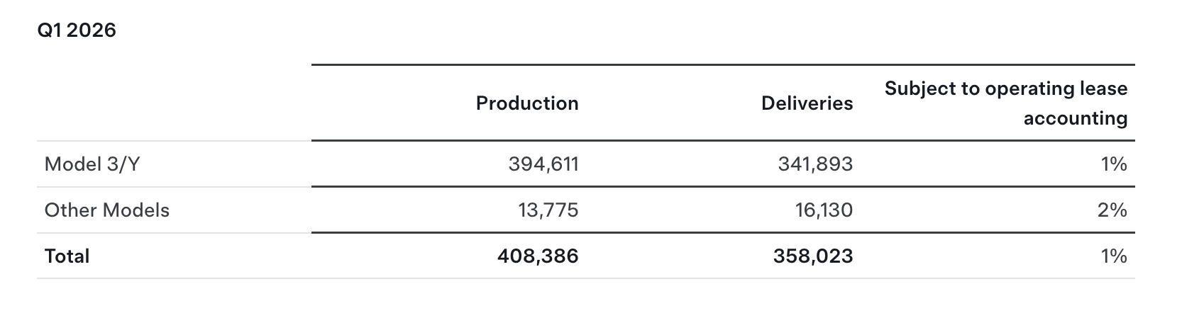 2026年第一季度,特斯拉全球交付量仅为358,023辆,不仅低于彭博分析师平均预期的372,160辆,更创下一年来最差水平。