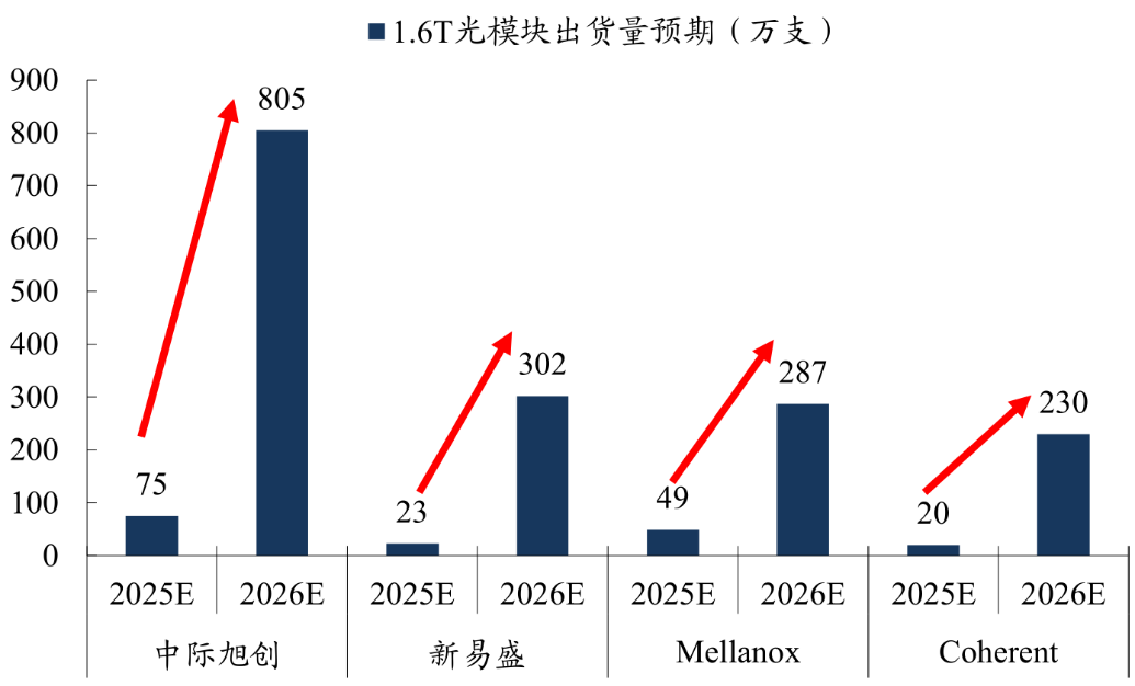 图:1.6T光模块2025-2026年出货量预期(万支)