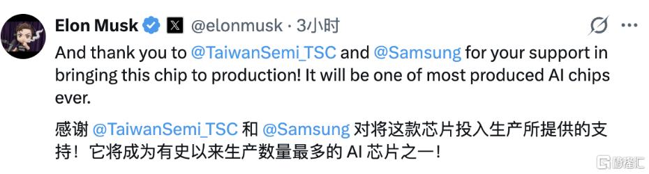在评论区中,马斯克同时点名感谢了三星和台积电。