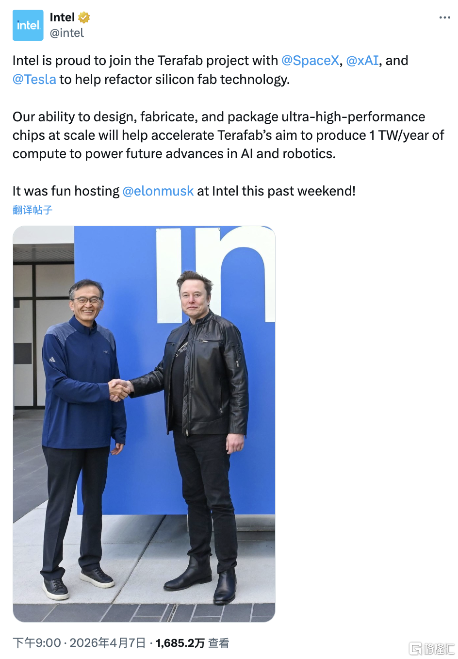 4月7日,英特尔公司在“X”宣布,很荣幸能加入埃隆·马斯克的TeraFab项目,将帮助SpaceX、xAI以及特斯拉重构硅晶圆厂技术。