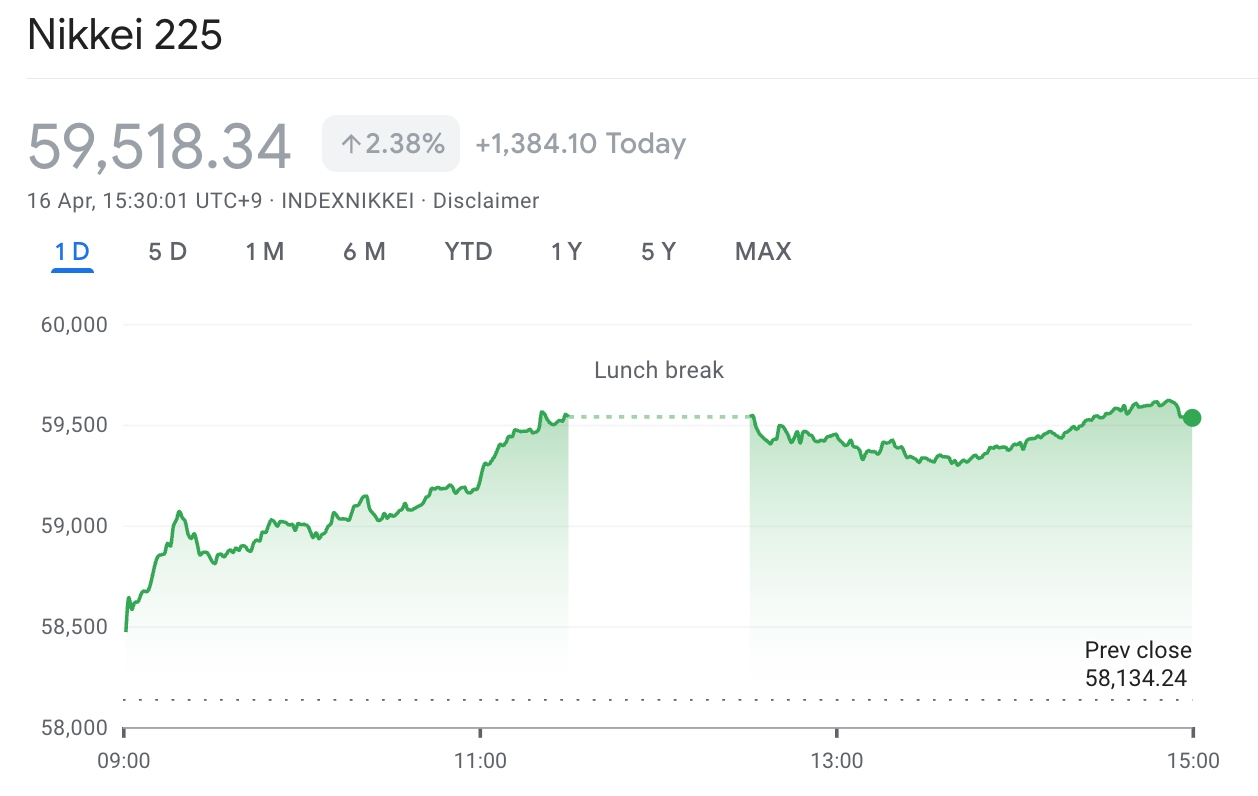 TradingKey - 4月16日,日经225指数不仅收回美伊冲突爆发全部跌幅,并且在收盘再创历史新高,收涨2.64%,报59667.89,延续近期强劲上行趋势,指数年内涨幅累计18.23%。成为全球主要市场中表现最为突出的股指之一。