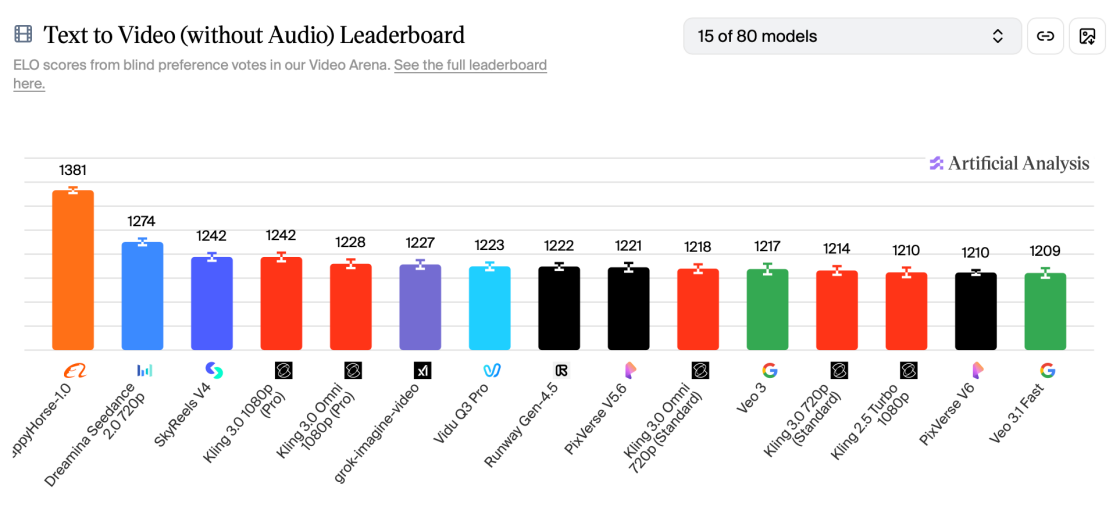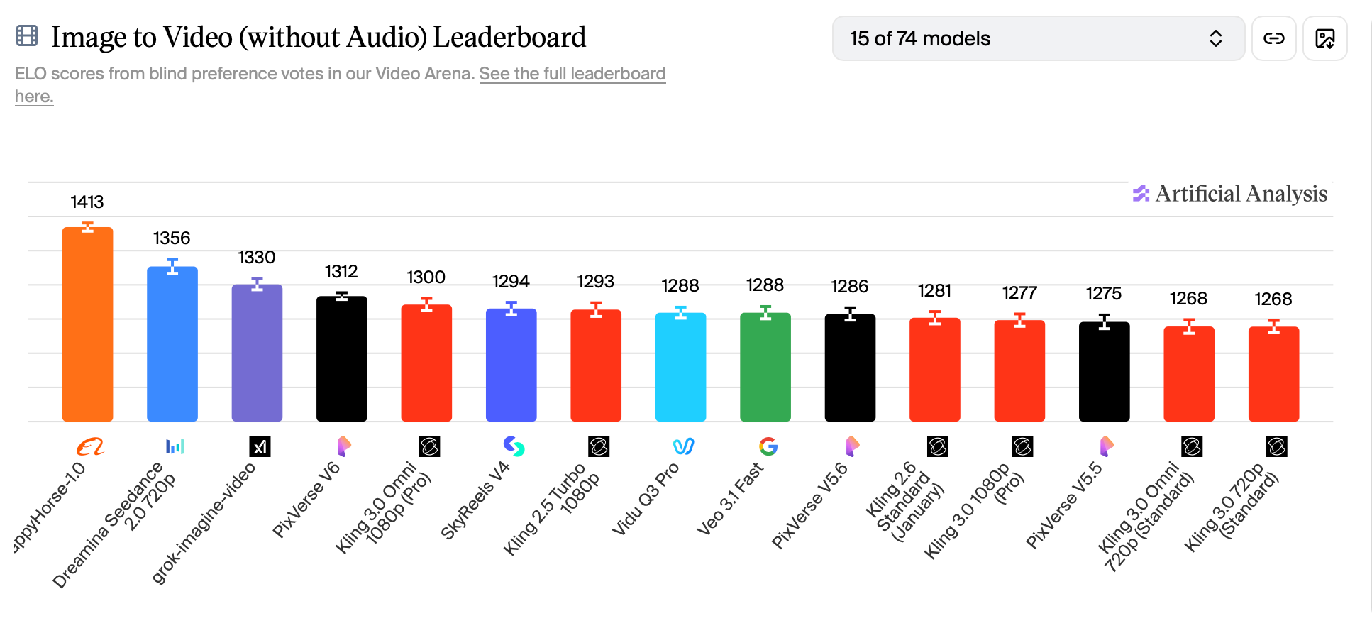 Artificial Analysis采用Elo评分机制,用户在不被告知模型身份的情况下,仅凭视觉观感选择更优视频。这种机制最大程度还原了普通人的真实审美偏好,而非厂商自报的"跑分炫技"。HappyHorse的成绩堪称"暴力屠榜":文生视频赛道1381分,和第二名Seedance 2.0拉开100分差距;图生视频赛道1413分,直接刷新该榜单历史纪录。