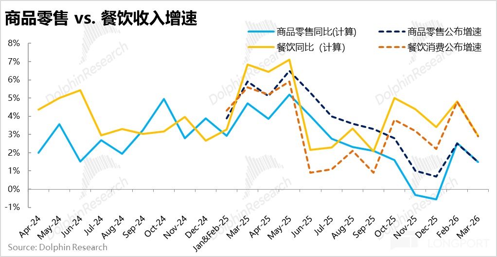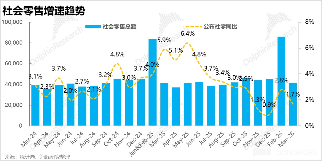 据统计局披露,3 月国内社零总额同比增长 1.7%,处在去年 12 月和今年 1~2 月增速的大概中间位置,可见本月确实更能精准地反映近期社零的增长中枢。