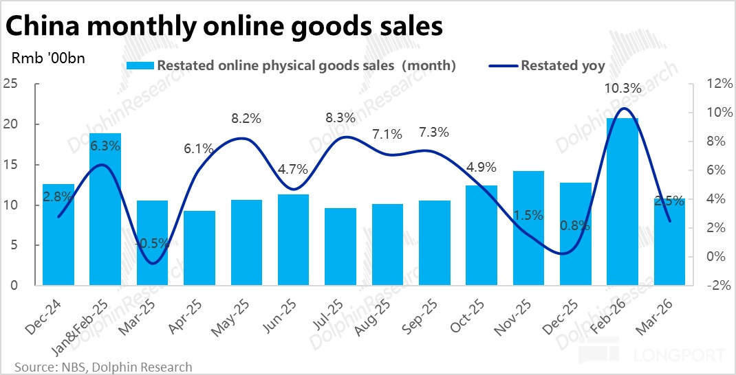 具体来看,3 月线上实物零售额同比增长为 2.5%,较 1~2 月的 10.3% 确实明显跳水,相比 12 月~2 月的 6.5% 加权平均增速也下滑不少。可见 3 月份线上零售较春节期间的放缓幅度相比整体社零更加剧烈。(当然部分原因是线上实物在 1~2 月的波峰更高)