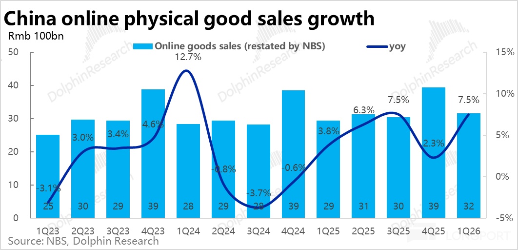 这应对会影响各大电商平台对一季度以后电商业务增长的判断,毕竟因 1~2 月增长不错,一季度线上实物零售增速达 7.5%,较去年 4 季时的低谷有明显反弹,还算可以。但今年剩下几个季度,尤其是 2、3 季度(基数最高)的前景就不那么乐观了