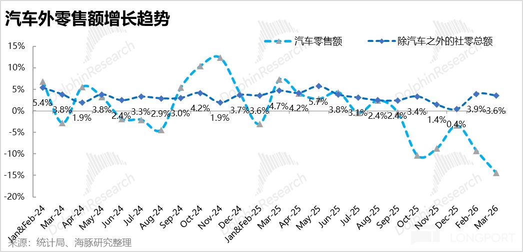 不过,相比12 月~2 月 3 个月间社零增速的加权平均值—2.1%,3 月份的增速确实是有走低的趋势。且从更长周期看,自去年 11 月以来社零的增长也属于除 20 年和 22 年两个特殊时期外的最差表现。