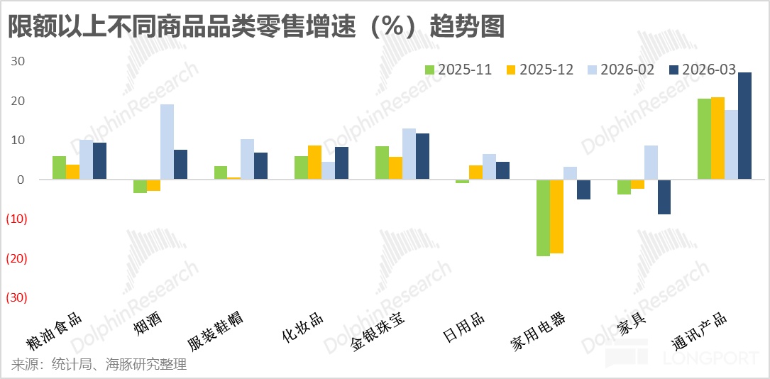 分品类看,哪些品类在 3 月份走弱最明显,哪些又相对坚韧?最大的单项--汽车销售在 3 月相当疲软(3 月内同比跌幅超 10%),可以说是最大拖累。按统计局披露的增速,3 月剔汽车后社零增速为 3.2%,较 1~2 月的 3.7% 放缓并不算多。即剔除汽车后,其他商品销售在 3 月还不算很弱。