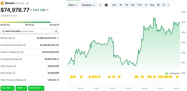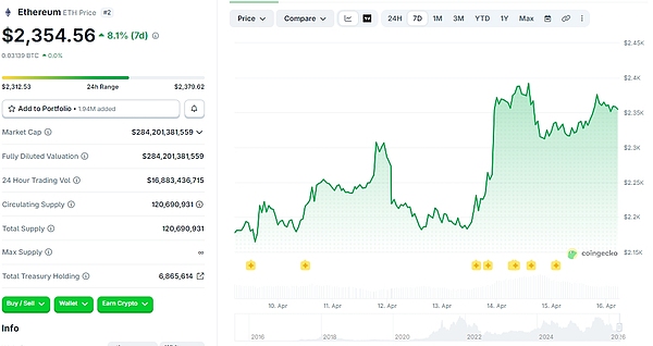 近期加密行情迎来反弹势头,BTC已连续三日在7.4万美元左右震荡,截至发稿报74978.77美元,7日涨幅5.9%;ETH 突破2300美元大关,截至发稿报2354.56美元,7日涨幅8.1%。