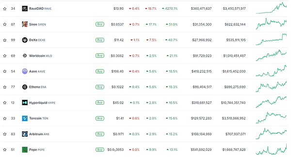 其他山寨币亦不乏佼佼者,RAVE 7日涨幅4270.1%,截至发稿报13.9美元;Srien 7日涨幅51%,截至发稿报0.8537美元;DEXE 7日涨幅40.7%,截至发稿报11.42美元;WLD 7日涨幅21.1%,截至发稿报0.3082美元;AAVE 7日涨幅18.5%,截至发稿报106.40美元;ENA 7日涨幅18.3%,截至发稿报0.1022美元;HYPE 7日涨幅16.5%,截至发稿报45.02美元;TON 7日涨幅15.6%,截至发稿报1.41美元;ARB 7日涨幅15.2%,截至发稿报0.1171美元;PEPE 7日涨幅13.1%,截至发稿报0.054美元。