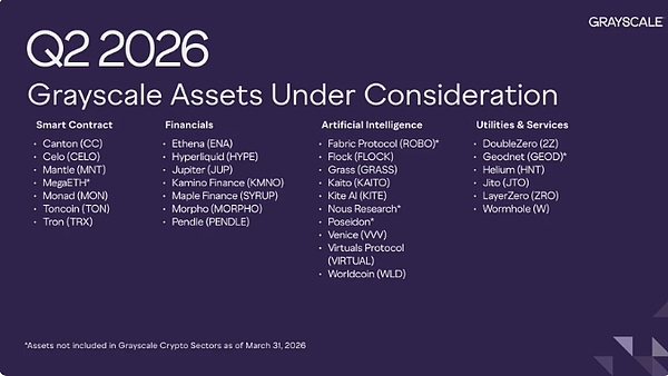 Grayscale Investments 发布了其 2026 年第二季度“正在考虑的资产”清单。