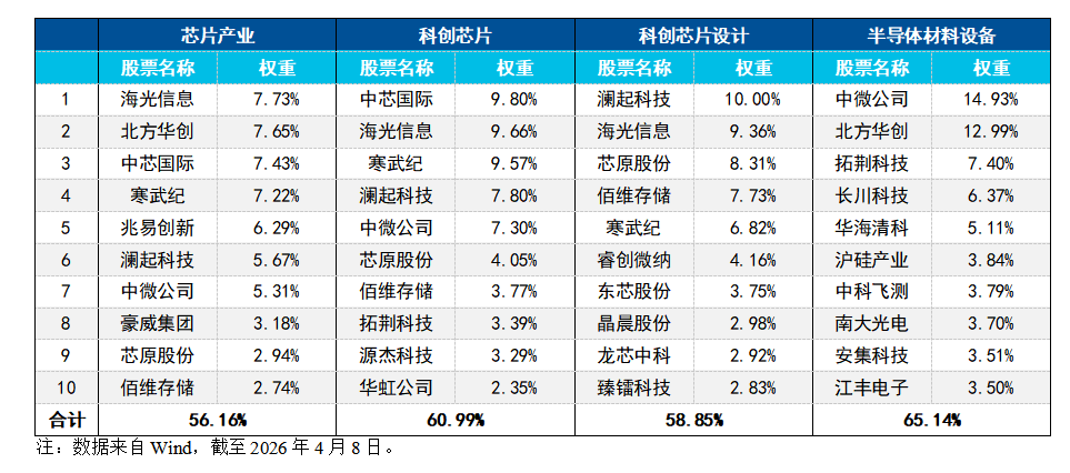 第三,权重股结构不同。半导体材料设备指数前十大成份股权重合计超65%,集中度最高,且以中微公司、北方华创、拓荆科技等设备龙头为主,充分凸显半导体上游环节的龙头地位。科创芯片设计指数则由澜起科技、海光信息、芯原股份等数字芯片设计公司主导,是AI芯片纯度最高的指数之一。芯片产业指数覆盖全产业链龙头,个股权重分布也更加均衡,海光信息、北方华创、中芯国际等占比较高。科创芯片指数中,中芯国际、海光信息、寒武纪等科创板半导体龙头权重突出,兼顾设备与设计环节。