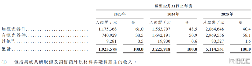 具体来看,2023年、2024年、2025年(简称“报告期”),天孚通信来自无源光器件的收入占比从61%降至40.4%,而有源光器件的收入占比从38.5%提升至58.1%,另外还有小部分收入来自集成共研服务及销售额外原材料与残料。