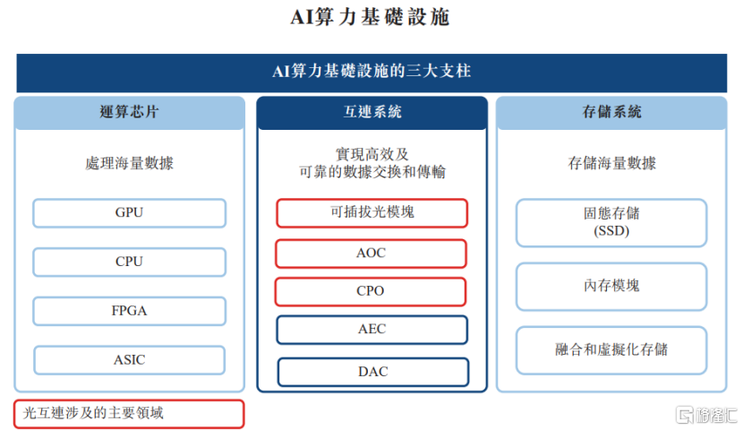 运算芯片、互联系统、存储系统是AI算力基础设施的三大支柱。其中,光互联主要涉及互联系统的可插拔光模块、AOC、CPO领域。