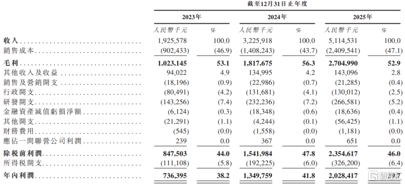 2023年、2024年和2025年,天孚通信的收入分别约19.26亿元、32.26亿元、51.15亿元,毛利率分别为53.1%、56.3%、52.9%,对应的净利润分别约7.36亿元、13.5亿元、20.28亿元。