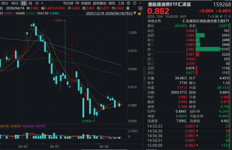 今日(4.16),A股单边大涨,创业板指涨逾3%刷新近11年新高,消费ETF汇添富(159928)收涨0.13%四连阳,全天成交额超2.5亿元!港股方面,聚焦纯正新消费的港股通消费ETF汇添富(159268)收涨0.46%。