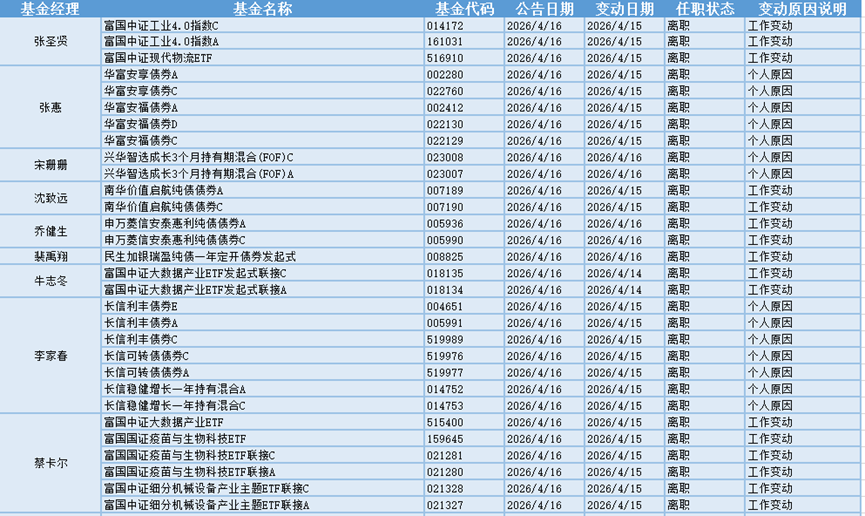 基金经理是一只基金产品最核心的成员,能决定一只基金的投资方向、投资策略以及投资风格,基金经理出色的择时选股能力和调研预测能力是基金业绩的有力保证,所以基金经理是投资者在选择基金产品时的重要依据。基金经理的变动很大程度上会影响到基金产品未来的表现,是一个需要特别关注的信息。4.16日共有19位基金经理发生任职变动。