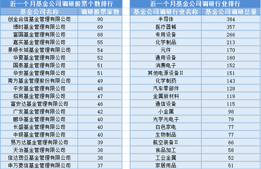 近一个月(3月17日-4月16日),创金合信基金参与公司调研的数量最多,共调研90家上市公司,此外调研较为活跃的还有博时基金、富国基金和嘉实基金,分别调研69家、68家、55家上市公司;从调研行业上来看,基金公司对半导体行业的上市公司调研次数最多,共有384次,其次是医疗器械行业,基金公司调研了357次。