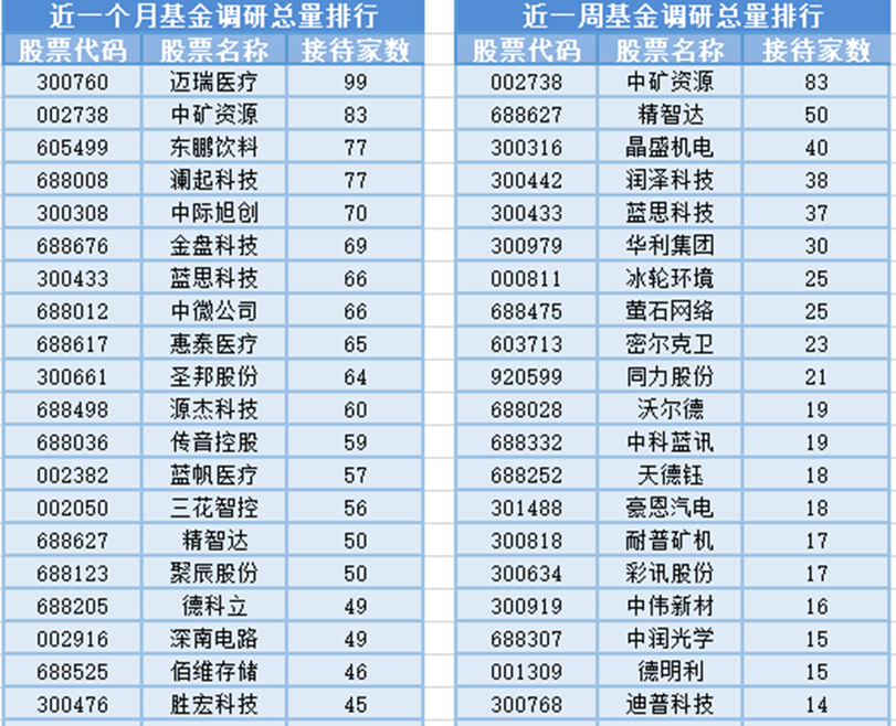 从个股调研情况上来看,最近1个月(3月17日-4月16日)最受公募基金关注的是迈瑞医疗,迈瑞医疗属于医疗设备行业,主营业务为医疗器械的研发、制造、营销及服务。共有99家基金管理公司参与调研,其次是中矿资源和东鹏饮料,分别接受83家、77家基金管理公司的调研。