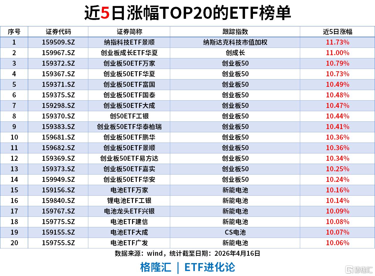 科技成长与新能源赛道同步发力。创业板50、创业板成长相关ETF包揽榜单前14席,其中纳指科技ETF景顺以11.73%领涨,创业板成长ETF华夏以11.00%紧随其后。
