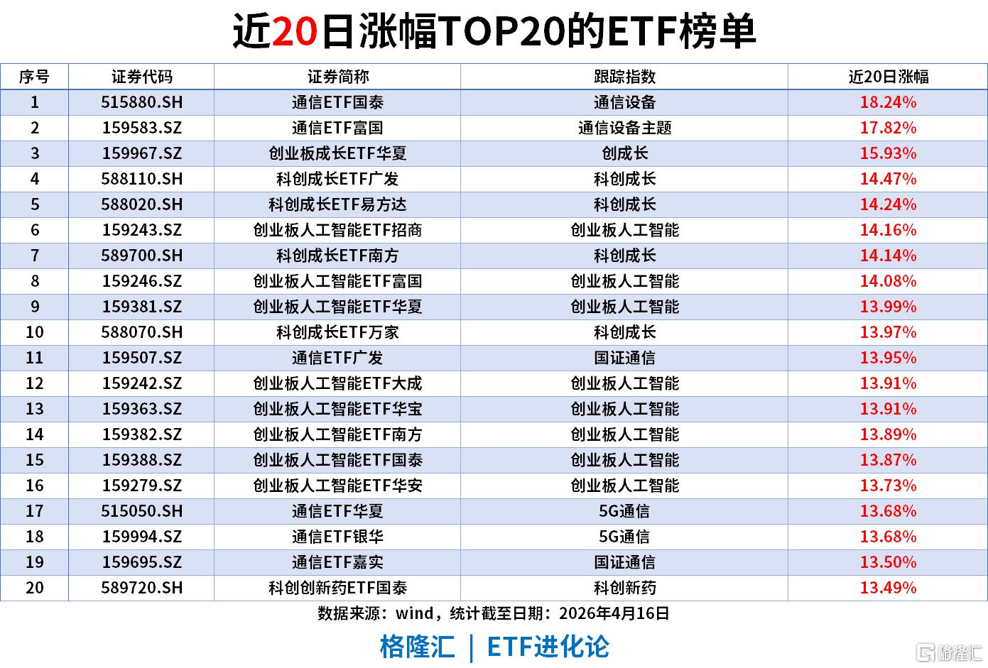 通信、人工智能与科创成长形成多主线共振领涨格局,通信设备ETF国泰以18.24%居首,创业板成长ETF华夏涨超15%。