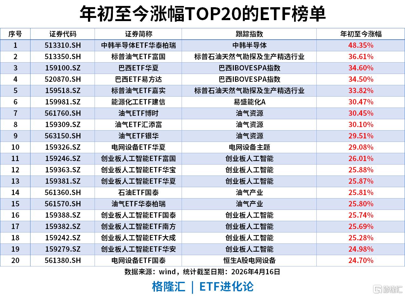年度主线格局清晰稳固,中韩半导体ETF以48.35%的涨幅登顶年度最强ETF,标普油气ETF富国、嘉实分别以36.61%、33.82%的涨幅位列第二、五位,油气赛道年度涨幅超33%。