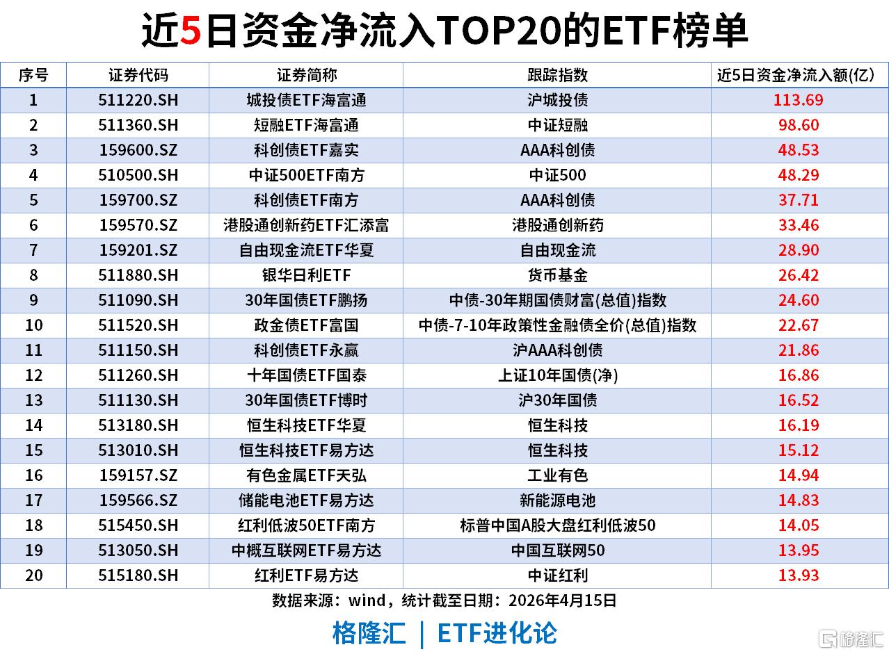 中期资金极致聚焦固收防御,债类资产成为绝对压舱石:城投债ETF海富通以113.69亿净流入大幅领跑,短融ETF海富通以98.60亿紧随其后。中证500ETF南方以48.29亿净流入位列第四。