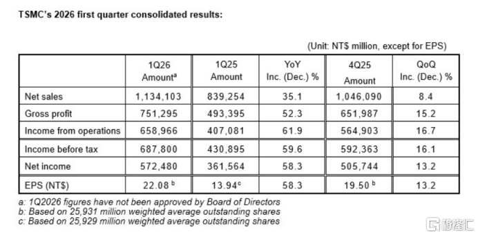 盈利端表现同样亮眼,第一季度,公司毛利率升至66.2%,大幅超出市场预估的64.5%;净利润达5725亿元新台币,同比增长58.3%,创下历史新高;摊薄后每股收益为新台币22.08元。