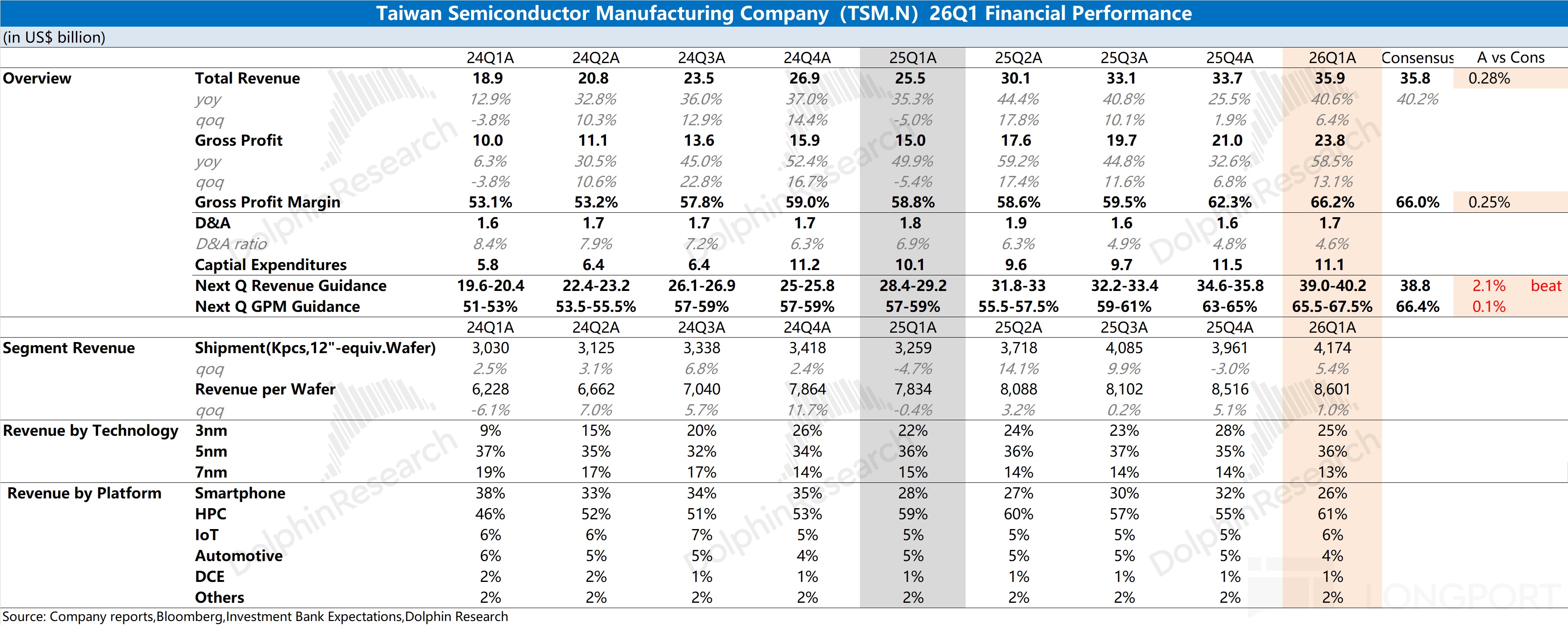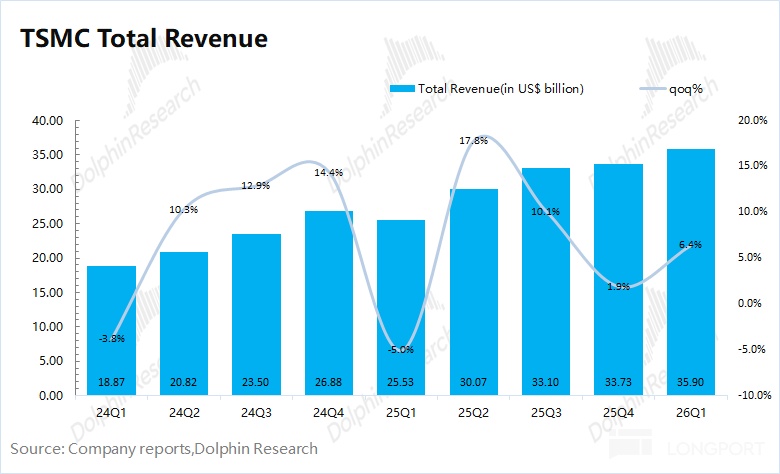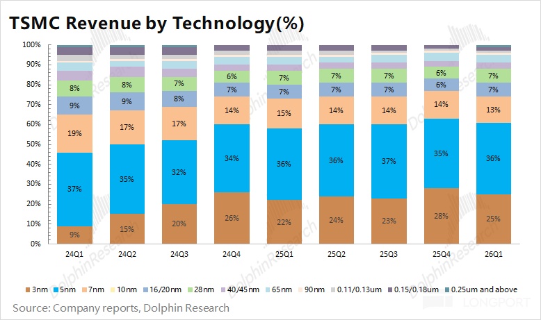 台积电在 2026 年第一季度实现营收 359 亿美元, 好于此前指引区间(346-358 亿美元)。本季度收入环比增长 6.4%,主要受 AI 芯片需求增长的推动,当前逐步从 5nm 转移至 3nm 平台。