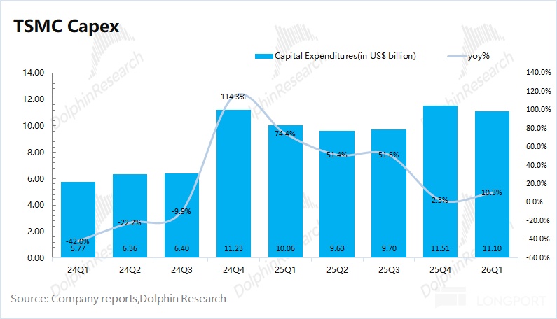 ②资本开支:台积电本季度资本开支 111 亿美元,由于公司将 2026 年资本开支计划再度上调至 520-560 亿美元的较高水位(此前是 520-560 亿),对应着台积电在随后三个季度的资本开支将有望达到 440 亿美元左右。
