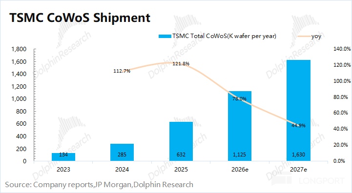 结合行业数据及市场预期,台积电目前 CoWoS 的月产能约 8 万片左右,至 2026 年末有望扩大至 12 万片左右。海豚君预估 2026 年台积电 CoWoS 的出货量有望达到 110 万片以上,同比增长 77%,其中英伟达和博通是最主要的客户。