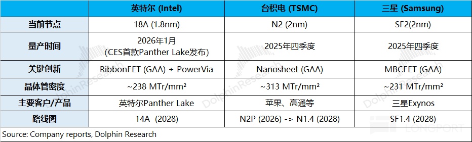 c)代工市场的竞争:在台积电 2nm 开启量产之后,三星和英特尔也紧跟着分别进入了 SF2(2nm)和 18A(1.8nm)节点。