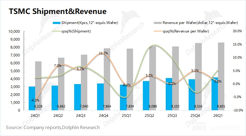 从量价关系看(等效 12 寸片):①台积电的晶圆出货量 4174 千片,环比增长 5.4%;②台积电的晶圆单晶圆收入(等效 12 寸片)8601 美元/片,环比增长 1%。