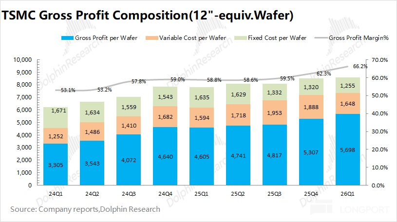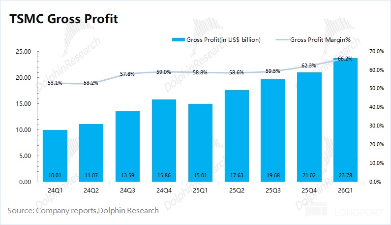 台积电在 2026 年第一季度实现毛利 238 亿美元,环比增长 13%。其中毛利率 66.2%,环比提升 3.9pct,接近上调后市场预期(66-66.5%)受均价提升和单位成本下降的双重影响
