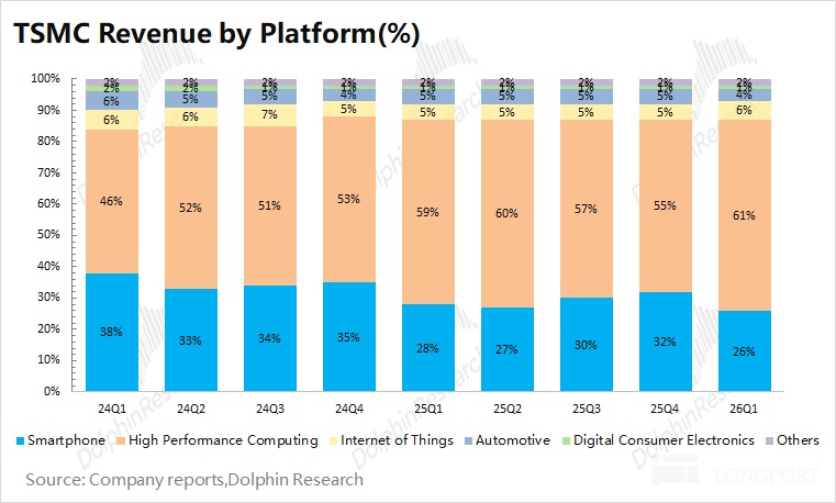手机业务出现 “季节性回落” 的表现。本季度手机业务收入 93.3 亿美元,环比下滑 13%。手机和 HPC 两项业务合计占比达到 87%,是台积电最主要下游应用领域。