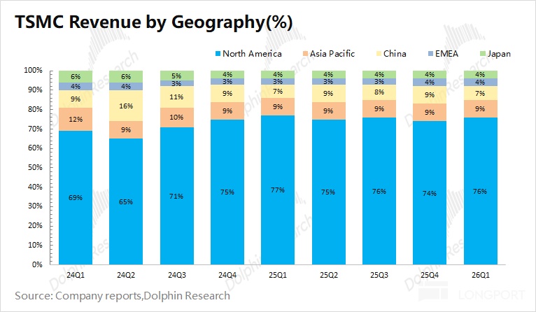 从各地区收入来看,北美地区仍是台积电最大的收入来源,收入占比为 76%。这是由于北美地区有苹果、英伟达、AMD、高通等大客户,使得台积电和美国之间有很强的商业绑定关系。