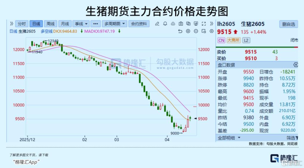 然而,生猪连续主力合约已经开始拉升,近3个交易日持续上涨,自低点至今反弹超5%,现报9515元。