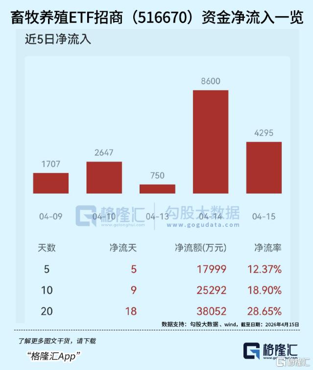 与此同时,截至4月15日,畜牧养殖ETF招商(516670)连续5个交易日内获资金连续净流入合计1.8亿元,年初至今份额增长4.38亿份,位居养殖类ETF第一。