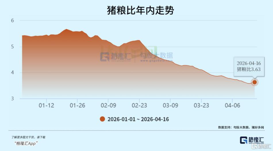 在饲料成本的不断上涨下,猪粮比价已跌至3.63:1,远低于5.5:1的盈亏平衡点。
